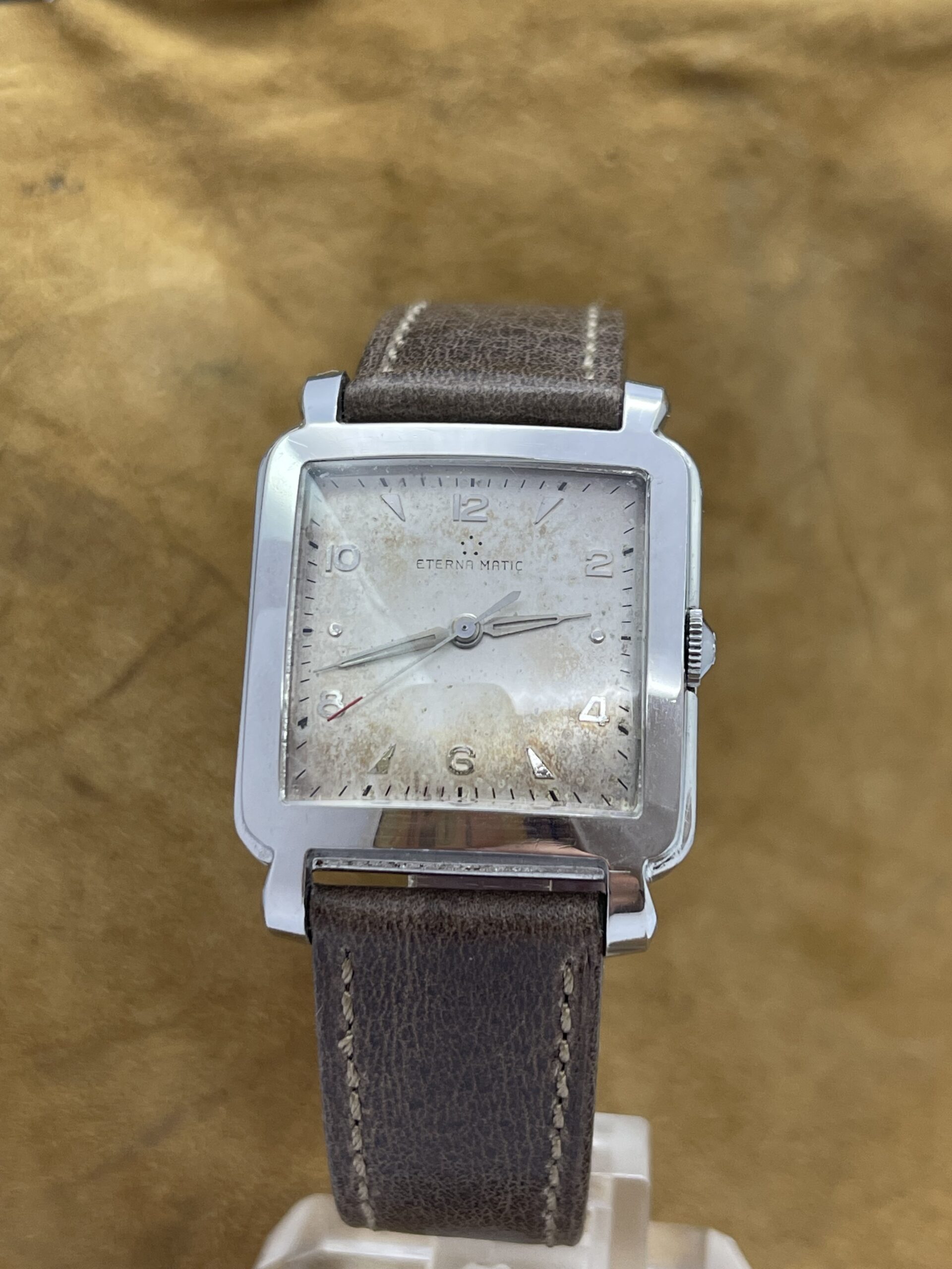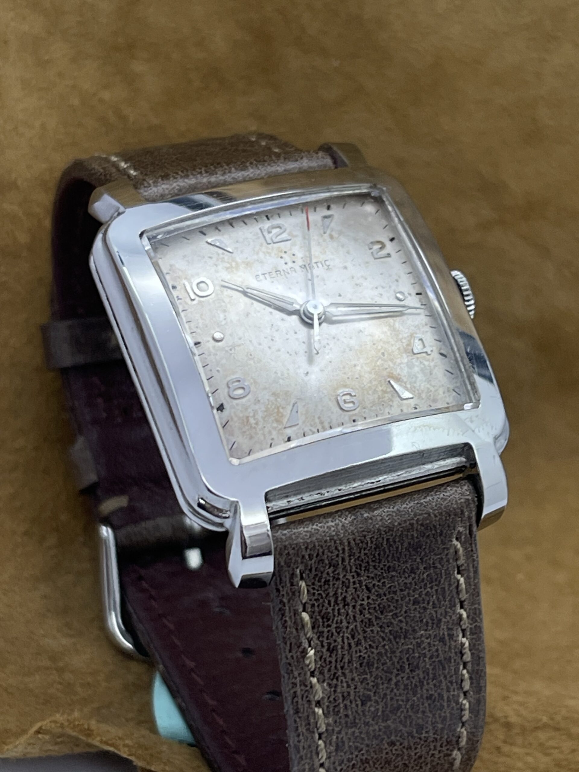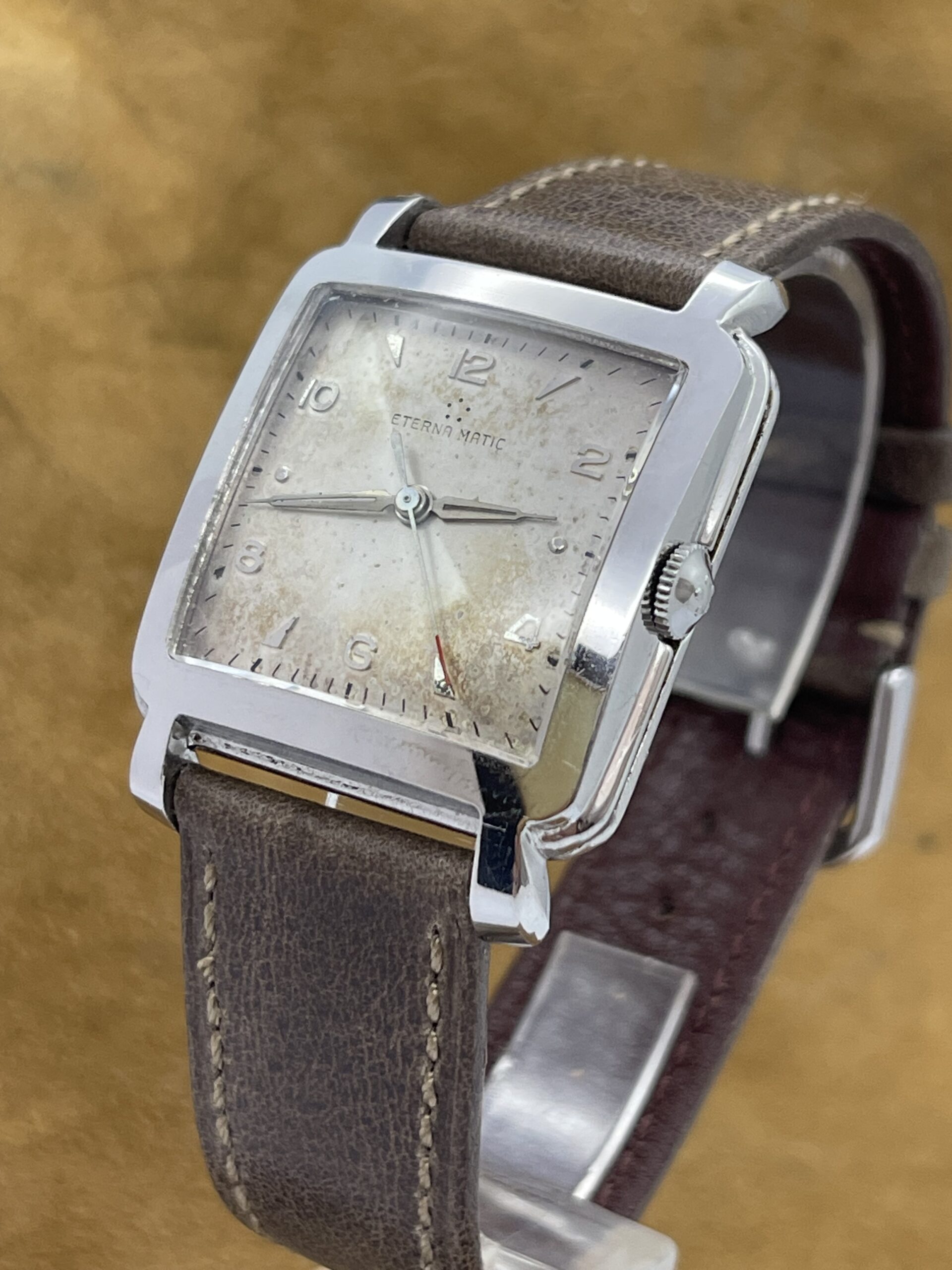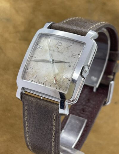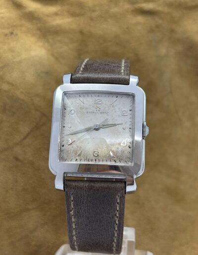 WATCHES Eterna – Matic Cioccolatone DESCRIPTIONBrand: EternaModel: Eterna MaticReference: Movement: Cal 1253 uc AutomaticYear: 1960 (aproximation)Condition: Good, Patina DialMaterial: Stainless SteelGender: Mens watch/UnisexSize: 32 x 40 mmBox and papers N/APrice: € 800,-