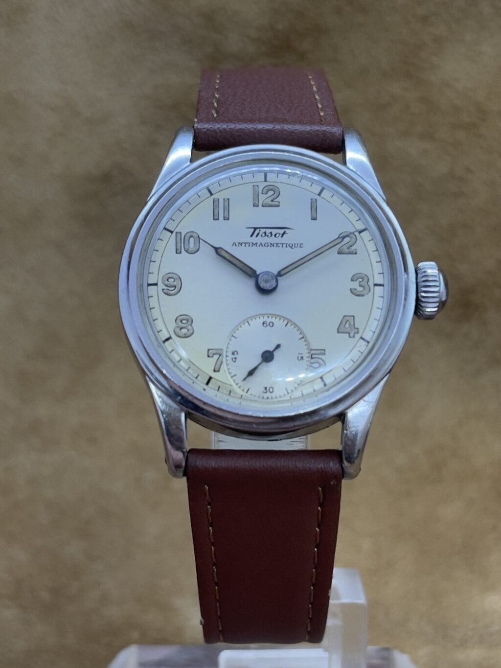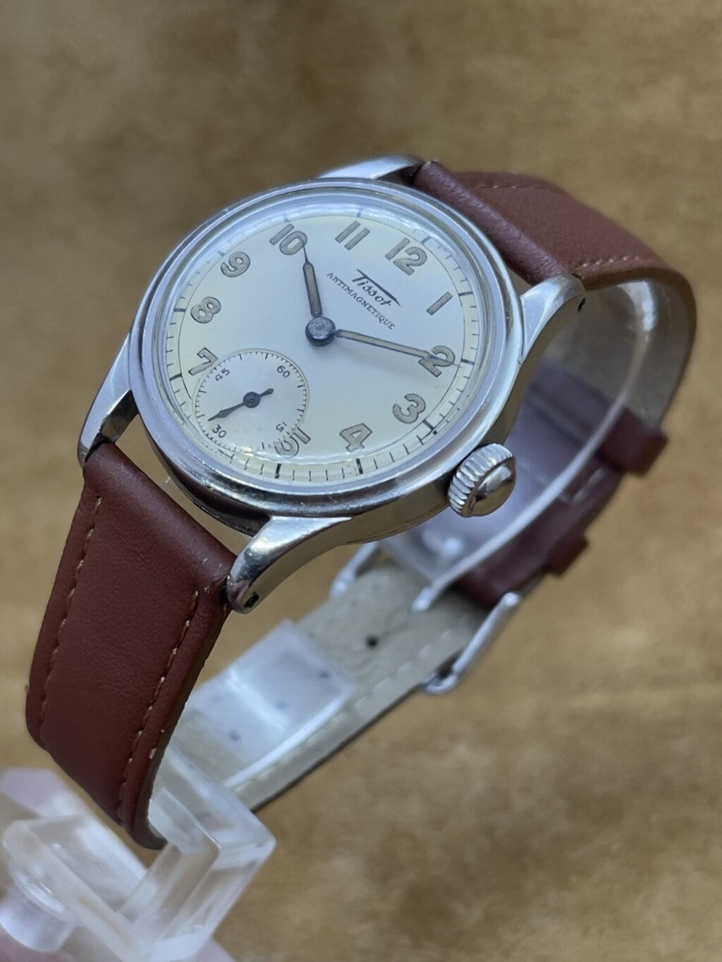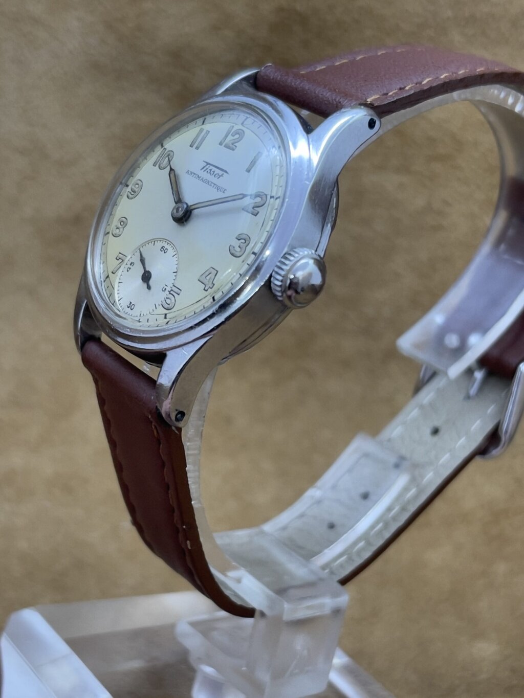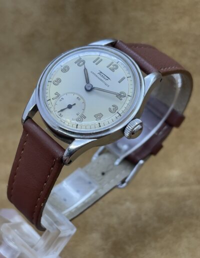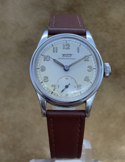 Watches 50 - 500€ Tissot Antimagnetique DESCRIPTIONBrand: TissotModel: AntimagnetiqueReference:Movement: manual wind cal. 27Year: 1940'sCondition: goodMaterial: Stainless SteelGender: Mens watch/UnisexSize: 30 x 38 mmBox and papers: N/APrice: € 450,-