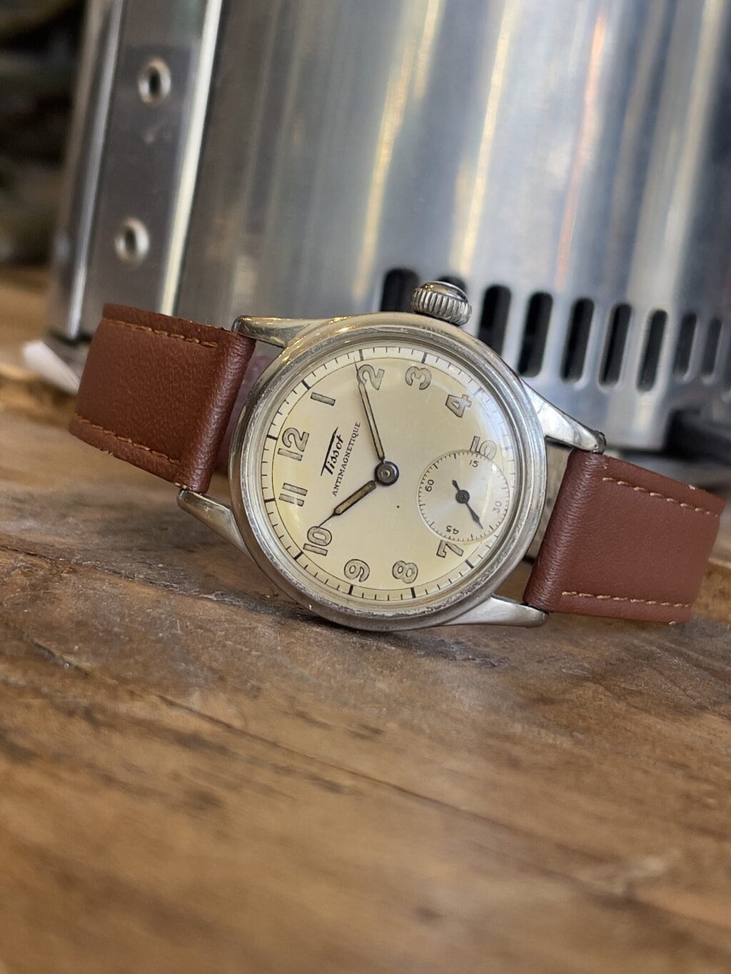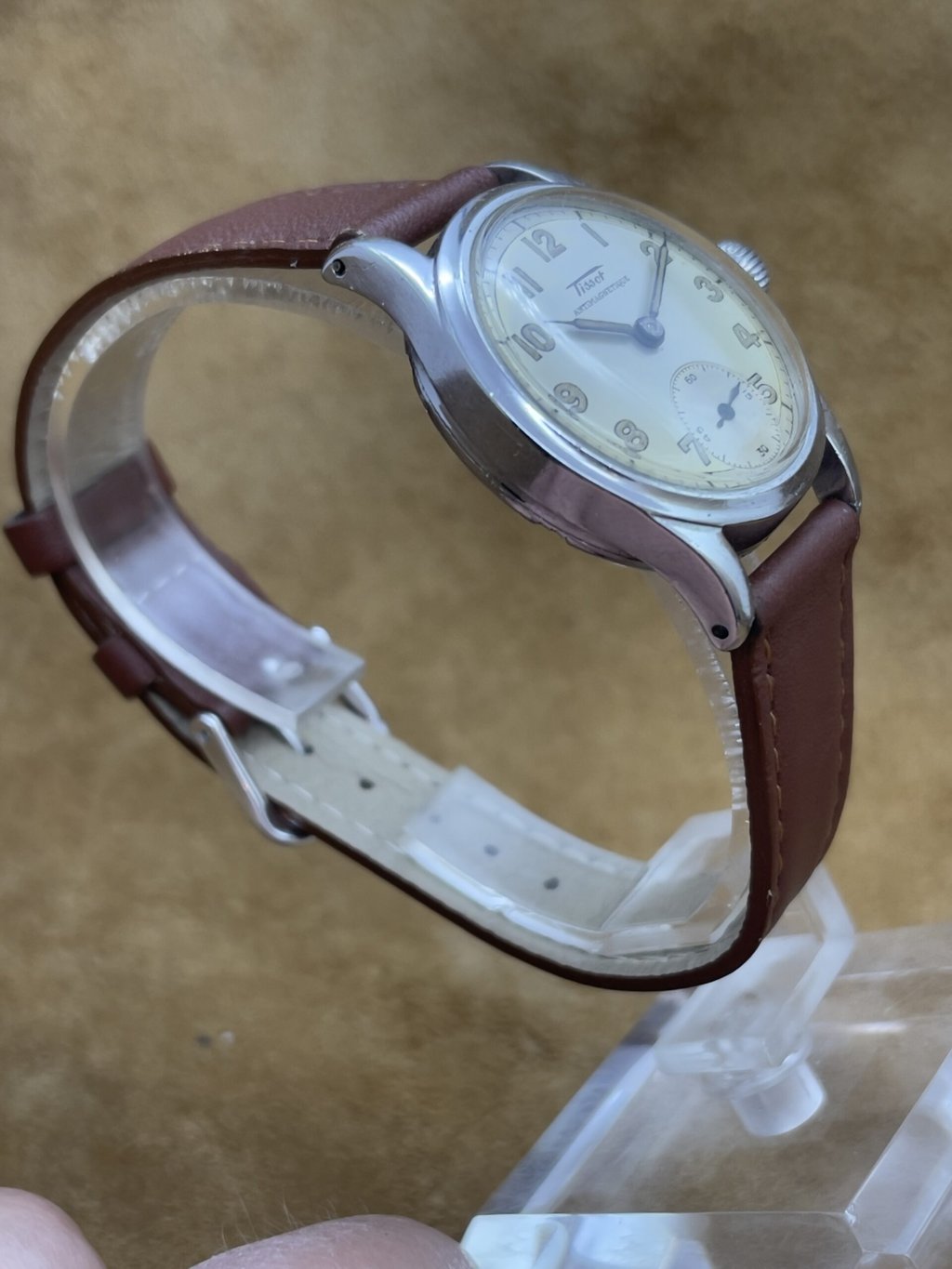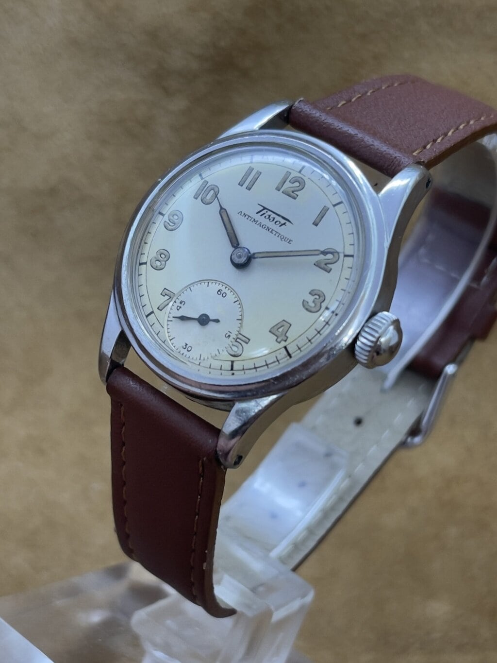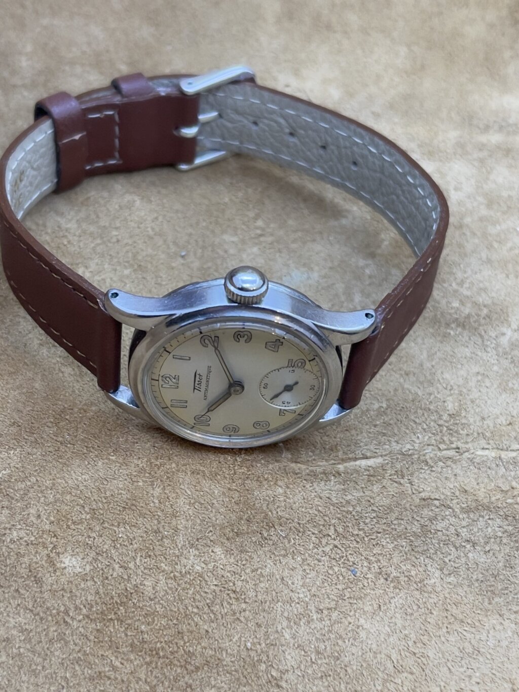 Watches 50 - 500€ Tissot Antimagnetique DESCRIPTIONBrand: TissotModel: AntimagnetiqueReference:Movement: manual wind cal. 27Year: 1940'sCondition: goodMaterial: Stainless SteelGender: Mens watch/UnisexSize: 30 x 38 mmBox and papers: N/APrice: € 450,-